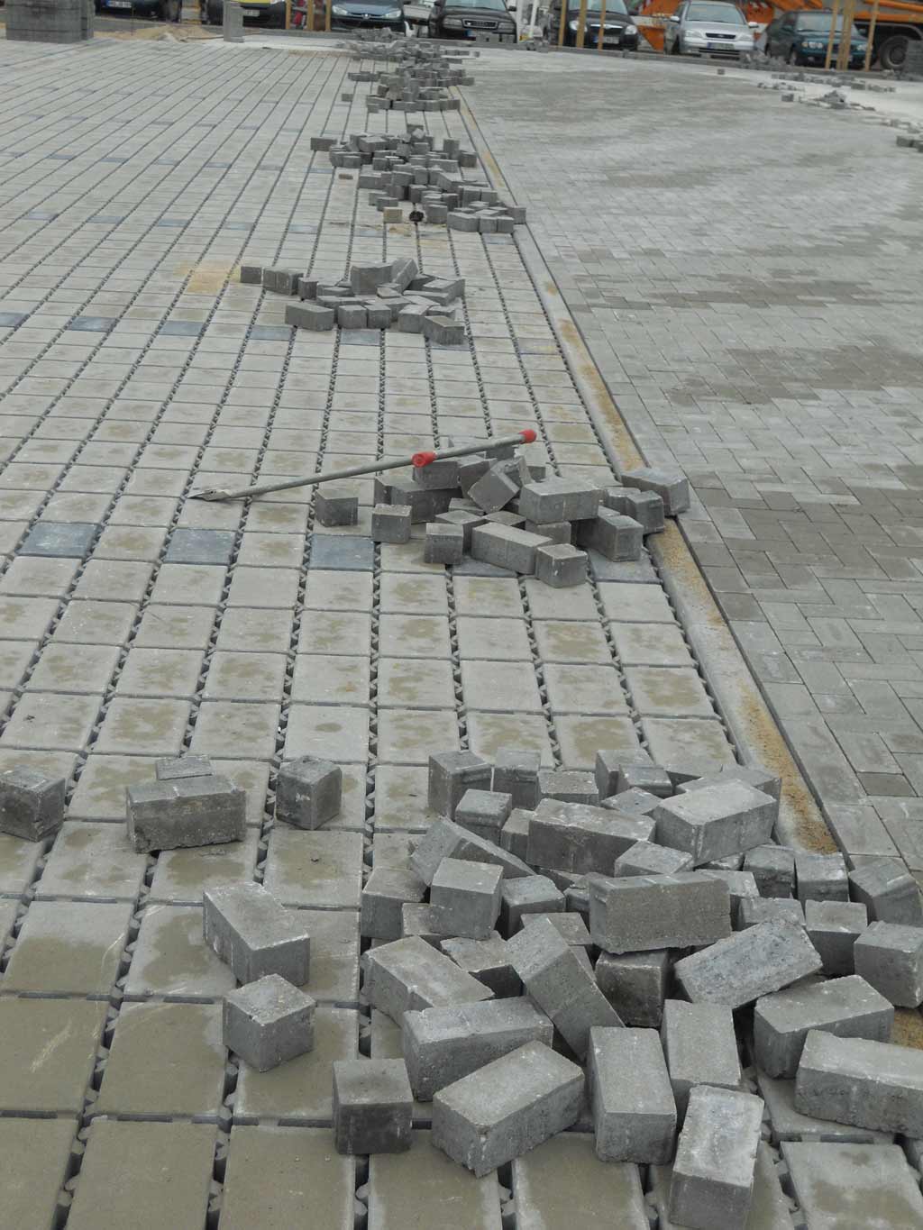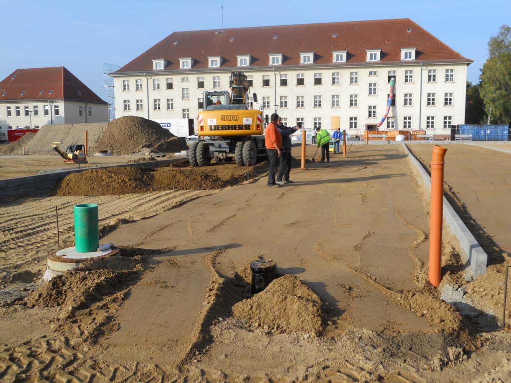 Großflächiger Parkplatzneubau auf einem ehemaligen Antreteplatz mit umfangreichen Bodenbewegungen, Kanal-, Landschaftsbau- und Pflasterarbeiten.